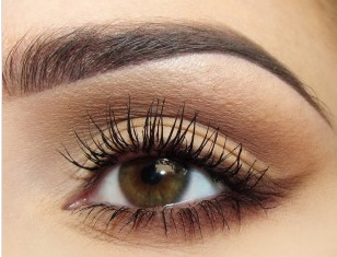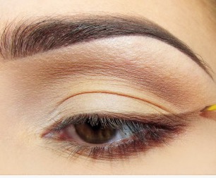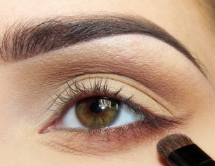 Na ruchomą powiekę nakładamy beżowy matowy cień, a na linii złamania nakładamy i mocno rozcieramy czekoladowy matowy cień. Na dolnej powiece od połowy w kierunku zewnętrznego cienia okrągłym pędzlem nakładamy ten sam czekoladowy cień, wyciągając go lekko poza kontur oka.