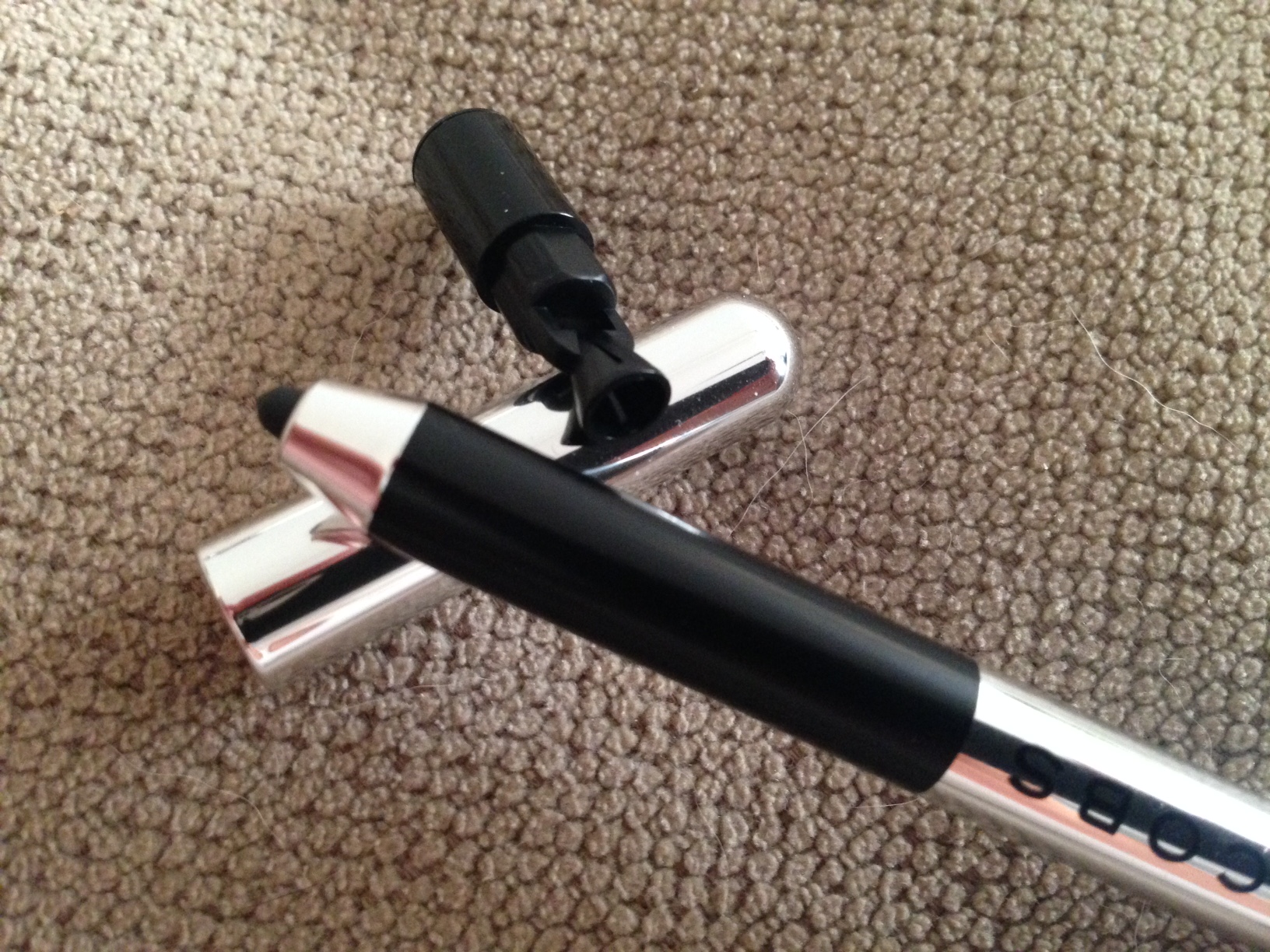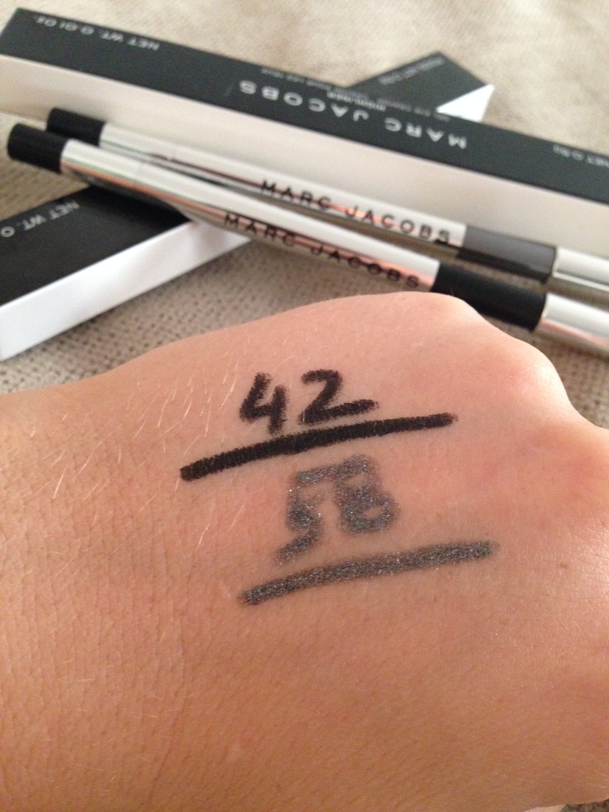 Wybrałam dwa kolory: oczywiście tradycyjną matową, czarną (nr42, blacquer) i stalową, opalizującą (nr58, stone fox). Obie kredki są automatyczne, czyli rysik jest wykręcany. Kredka jest szalenie elegancka, srebrna, bez zbędnych napisów. Ważne informacje, jak np. waga 0,5g zapisane są na pudełeczku, w które kredka jest zapakowana. Nie wszystkie kredki mają funkcję wykręcania i wkręcania rysika. Kredkę Marca Jacobsa możemy zarówno
